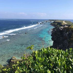 🎶南の〜風に乗って走るわ〜💙 クサトベラとサンゴ礁と 東平安名崎(ひがしへんなざき)🌊 岬の先の 白い灯台 見えますか❓ 名前を覚えるヒント→ヘンなザキヤマさん💙