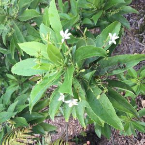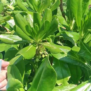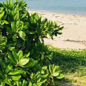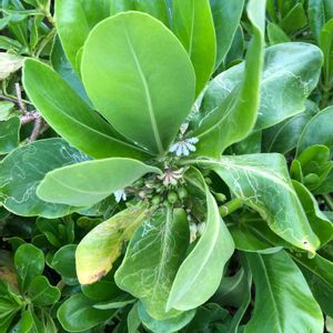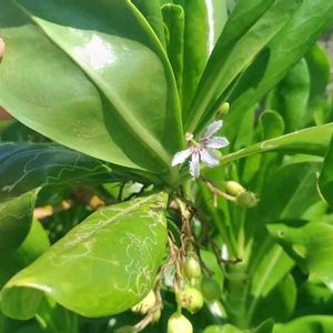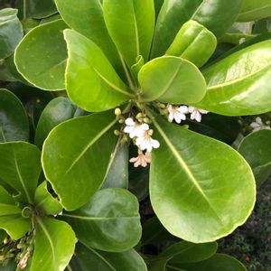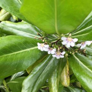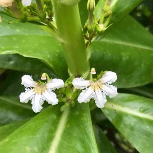 強い☀️陽射しにも耐えビーチなど海沿いでよく見かける艶々した🍃の低木。 葉の合間に咲いてる小さな白い🌼…花弁は5つですが、半分に切ったように下側・扇状に開きます😆
