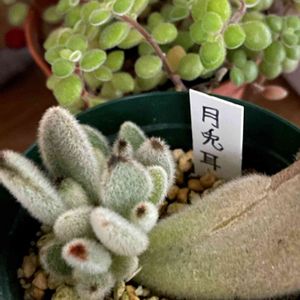 *月兎耳🌱カランコエ属 🏷ウサ耳祭りに初参加させて頂きます♪ 葉挿しからの成長ですがゆっくりですョ♪( ´▽`) 柔らかいモケモケが心地よいです♡ 気温12℃空気が冷たい夜ですよ🍂 明日の夜はかなり冷えそうですが多肉さん大丈夫かな? 湿度も低いですね!乾燥していますョ