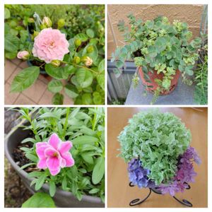 おはようございます☀️ ①ミニ薔薇がチラチラ咲いています🌹 モカ マイグラニー ②栄養系コリウス、赤色に近いジニア、ニチニチソウ ホワイト ③④宿根バーベナ アイストゥインクルがもりもり咲いています🤍🩵何年も植えっ放しで強いです🥰 ⑤エキナセア🩷唯一地植えで10年以上咲いてくれています。去年は咲いてくれなかったので今年は期待していなかったのですが 、気が付けは咲いてました。