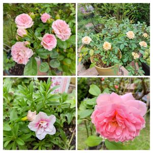 こんにちは😊 雨が昼間も少し降りましたが、今から夜まで降り続くようです☔ 昨日からお水まきしていません🙌 ①ミニ薔薇 ハナグルマ ミニ薔薇 モカ カリブラコア ウノダブル チェリーフリル ジュビリーセレブレーション ②八重咲きムクゲ 蕾の数は少ないですが、咲いてきました。 薄っすらピンクに中心が濃いピンクですが、遠いせいか白っぽくしか撮れません🤣