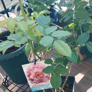 2週間ほど前に剪定と植え替えをしたブロドリー 根本に赤いポチ!ベーサルかな😲 バラの家の土 オーガニック元肥 根を育てる肥料 を規定の量入れました