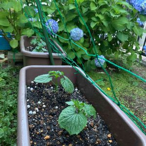今年のグリーンカーテンはゴーヤにしました。やっぱ収穫物が楽しみ♡ 紫陽花の葉の色が悪かったので 夕方蚊🦟と格闘しながら💦 液肥をスプレーしました