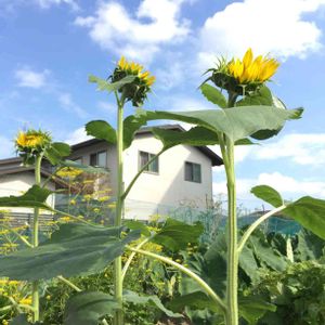 おはようございます☀ めっちゃ青空だけど 反対側は黒っぽい☁︎ 雨降らないでね〜 もう少しで🌻咲きそう わが家ではなく実家の畑です☺︎