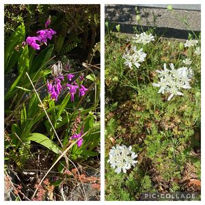花散歩⑥ もう咲いていました🌸🌸 左は紫蘭💜 右はオルレア🤍 陽の当たる場所に咲いていました。しかし早いですね〜💕