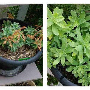➡️間引いたはずの地植え子持ち蓮華‼️ さらに増えてる〰️🤣 ⬅️間引いてお一人様にした子 ずいぶん巨大化‼️🤣