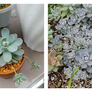 ゆうが多肉🌆 ホワイトミニマ。 この前までカラカラだったけど こちらも思いきって雨に当てたら すっごいプクプクに復活🙌 葉っぱがビフォーアフターで別人👀 子株も少しずつ大きくなってます‼️