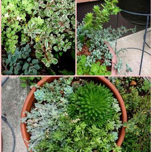 連投失礼します 外の多肉さん達☘️ きちんと寄せ植えした訳でなく 『逞しく育てよー👊』ってポイポイ入れてたら ホントにデカくなりました(*゚◇゚) このままでいいのカナ(。•́•̀。)💦 左上→トリカラー? とか? 下→子持ち蓮華、爪蓮華、? 右上→びよーんって伸びてるのなんだっけ? 名前忘れちゃったです(。•́ωก̀。)…グスン