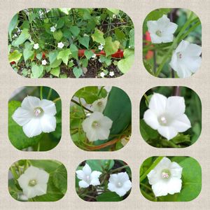 🤍小花日記🤍 今日のお庭から… 葉の間から見え隠れする豆朝顔 チラチラ 小さな☆みたい 蕊に赤い斑点があるのも 愛らしいわ😃
