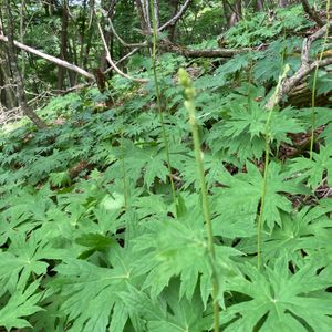 東京の植物園巡り🌿 最後は… 「ヤブレガサ」が蕾を茎の先に伸ばしています。似た葉はいろいろありますが、細かく深裂して、裂片が細長いのはヤブレガサの特徴ですね。花序の形も種類によって違います😊