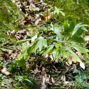 キク科ヤブレガサ属 多年草 ヤブレガサ(破れ傘) Syneilesis palmata 山地の雑木林や森の中などに自生する多年草。名前の由来は、早春、若葉の姿が、破れた傘をすぼめた様子に似ることから。葉は互生し、葉身は30-50cmで掌状深裂する。夏から秋にかけ、茎頂に円錐花序をだし、小さな花を多数つける。若芽は食用になる。モミジガサによく似るがヤブレガサのほうが葉の切れ込みが深い。