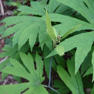 お友達の家でヤブレガサの葉を見たことがあって、どんな花が咲くのかなと思っていたところ蕾だけでも見られました。 2023.5.20 東邦大学薬学部薬草園にて