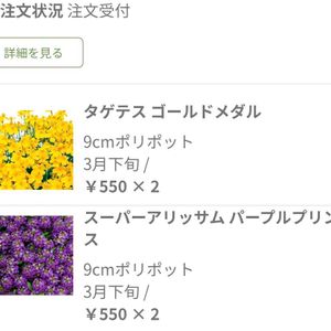 2025年春 お迎え第一弾 3月下旬受取予定 @my hometown 商品名:タゲテス ゴールドメダル 3月下旬 単価:¥550 数量:2 商品名:スーパーアリッサム パープルプリンセス 3月下旬 単価:¥550 数量:2 商品名:スーパーチュニア(R) ビスタ ジャズベリー 3月下旬 単価:¥550 数量:1 商品名:スーパーチュニア(R) ビスタ シルバーベリー 3月下旬 単価:¥550 数量:1 商品名:スーパーチュニア(R) ビスタ スノー 3月下旬 単価:¥550 数量:1 商品名:スーパーチュニア(R) ラヴィ ドゥヴィ 3月下旬 単価:¥550 数量:1 商品名:スーパーチュニア(R) ラズベリーチーズ 3月下旬 単価:¥550 数量:1 商品名:スーパーチュニア(R) ビスタミニ ブルースター 3月下旬 単価:¥550 数量:1