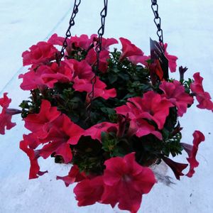 3月にホームセンターで締まった苗株を買ってハンギング 一ヶ月で摘芯もなしにここまでとは、さすがサフィニア!! プレミアムのレッド、大人色だわ。