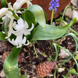 おはようございます☁️ 今朝🤳ムスカリちゃんとヒヤシンスさん🍃 一つだけ😄 プランターのムスカリも顔を出し始めました💜