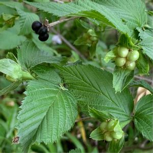 白山吹の実が黒くなってきました〜👀🖤 よく見ると、一つかじられていますね😅 艶々と美味しそうに見えたけど、鳥も不味かったのかな〜、全部食べてないですねー💦 白山吹はバラ科シロヤマブキ属で花びら4枚、 山吹はバラ科ヤマブキ属で花びら5枚 ということです🧐