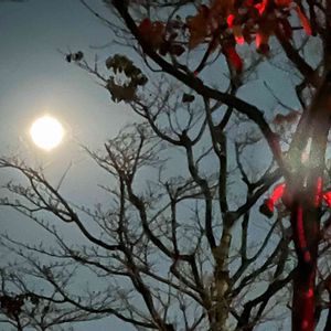 🏷満月の夜 買い物帰り、 あれ?月が、、、満月かな🌕 きっと満月❣️と撮っておきました🤳✨ 手前の赤いのは、信号の赤色に染まったヤマボウシ❤️ 今年最後の満月🌕 偶然にも見る事が出来て良かった🥰