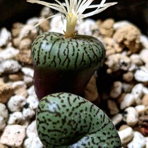 コノフィツム マーベラスミルクマン 我家で一番に咲いたコノフィツムです 去年は次々に溶けてしまいましたが今年は無事に脱皮、 しかも2つが5つに❗嬉しいです💓 寒くなると球体の網目模様が赤茶色く色付きとても綺麗な姿になります オシャレさんなコノです
