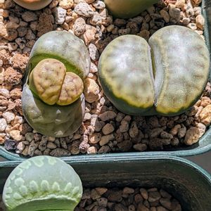 只今リトープス達がザワザワ動きだし一年で一番ワクワクの時期到来です(o’∀`)♪ Aグループ 左右対称綺麗に脱皮進行中 とてもオジョウズ~😃 (青磁玉 朱弦玉) Bグループ 覗き混むと2つ?3つ?入っていそ~🔍️ さて、いくつ出てくるかお楽しみ💓🤗 (オリーブ玉 福来玉 ) Cグループ 脱皮困難中💦😱 上のリトは下から割れ出てきました 下のリトは脱皮した後また脱皮しようとしています二重脱皮🤔 (緑福来玉 黄微紋玉) 冬型とは言えこの寒さの中ムクムク動いているリトちゃんず💓とても可愛らしいです 頑張れ✊リトちゃんず~