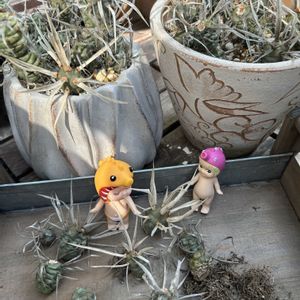 見て見て〜 マイメロさんのミャクミャク鉢と息子のミャクミャクの共演🥹💕 小麦粘土で作ったから 割れてきちゃった息子のミャクミャク🥲 小麦粘土むずかしいわ…… やはり、昨日水やりすべきだったな…… 乾き半端ない……🫠