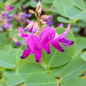歩道脇の植え込みの中で咲いていた萩の花。 AIがヤマハギと教えてくれました❣️ 秋の七草の萩だそうです。 ミヤギノハギのように枝が垂れず、長い花序が葉っぱぬ間から出て目立つのが特徴だとか。 最近あちこちで見かけるアレチヌスビトハギとは全然違っています😅
