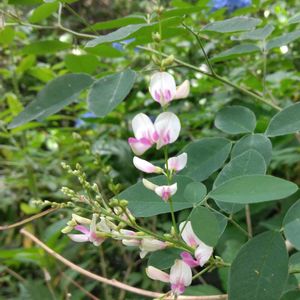 ヤマハギ マメ科ハギ属 落葉低木 アジア原産 北海道〜九州に分布 秋の七草のハギで、山野にふつうに見られる。 観賞用に庭木や公園樹としてよく植えられる。 花期6〜9月 エンドウのような総状花序となり、長さ12〜15mmの蝶形の紅紫色の花を付ける。 花言葉は「思案」「内気」