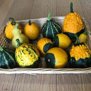 🎃オモチャカボチャ🎃 スーパーの野菜売り場に並んでました😊 可愛いね❣️何種類あるのかな? 1個99円、高いのか?安いのか? 食べられないからね~ 同じ値段のゴーヤをカゴに入れ、オモチャカボチャは写真に撮って来ました😊