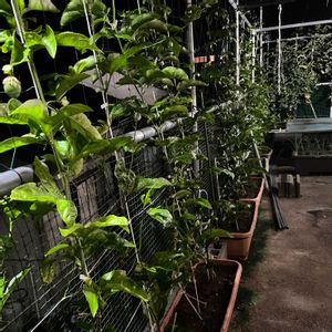 夜の園芸同好会です。 我が家の2階のベランダのようすです。 バラ、パッションフルーツ、イエローパッションフルーツ、ミニトマト🍅、ブドウ🍇、ゴーヤ、オモチャカボチャ🎃、アサリナ、君子蘭などを植えてあります。 基本的にベランダはタイマーで自動的に水やり💦ができるようになっています。 グリーンカーテンがもう少しするといい感じになると思います。