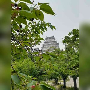青空に白いお城が映えます♡♡ 手前の大きな木には薄紫の小さなお花がビッシリ 咲いてる…💦 どの角度からも上手く写せなかった💦 お城も恥ずかしそうに 緑濃い木で半分隠れてる