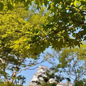 モミジバフウ越の 国宝姫路城 空を見上げて お城🏯を確認してOK! 今朝も沢山の黒い殻が落ちていました。 今朝は緑💚 秋が近ずくとオレンジ色 赤色〜💜紫色… 紅葉が楽しみ♡ 後3回は登場します✌