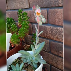 放置組の子(´>_<`) 何か伸びてるのは知ってました…💦 可愛らしい🍑の様な お花が咲きだし( ˙︶˙ ) 株分けしたけど名札📛の付け忘れ😂🤣 軒下で放置してた子♡