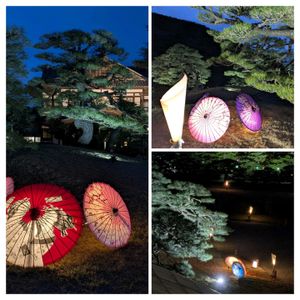おはようございます😊 日曜日 夜の部 栗林公園 春のライトアップ ①②桜と和傘のコラボ ③花より団子🍡茶店の前の桜とミモザと足元に桜吹雪ライト ④⑤湖面に映る桜🌸💮 寒かったけど…綺麗でした。「花の命は短い」弾丸お花見日曜日でした。