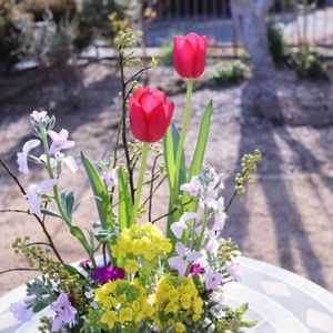 春のお庭風アレンジメント チューリップと菜の花をメインにした優しい春のアレンジメント。 朝から☔でしたが午後からは☀️て暖かくなりましたね➰🎵 明日はどうかな⁉️ 気候が目まぐるしく変わるのでついて行けない❗ 風邪、インフルエンザに注意しましょう‼️