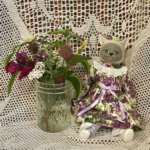 コミュニティガーデンからのお花たち。 カットして来てアレンジするのが楽しい😊 以前投稿したダリアにノラニンジンとパースニップ。後はアスター。 パースニップはガーデン中に広がって雑草化していますが、お花は面白いアクセントになるしミツバチもこのお花が大好きなんです🐝 このお嬢さんは日本製。 青い目をしたお人形は、アメリカ生まれのセルロイド🎵ってありましたよね。この子の場合は、日本生まれのビスクドール🎵ってことになります。1915年生まれだそうです。 今のノリタケの前身のモリムラブラザーズという会社があって、ビスクドールをアメリカに輸出していたそうなんです。 その頃ビスクドールはフランス製の高価なものから、安価で品質も良いドイツ製が主流になりつつあったそうです。でも第1次世界対戦が勃発し、ドイツからの輸入は途絶えて日本製のビスクドールの需要が伸びたとか。でも「モリムラドール」は7年間しか生産されず、数が少ないので珍しいと何かで見ました。 そのお人形をネットオークションで見て、おっ❗️と思ったんです。 25ドルからスタートなので賭けてみた。古いのに状態も良いようで、そういうのはどんどん値が上がるので まさか手に入るとは。 賭けたのは私だけだったんです😳 そんなわけで家に来てくれました。 ご対面して、改めて日本の物作りの技術ってすごいなって感心しました。 モリムラドールにはこの子の様に 西洋人のお人形から、どことなく東洋風の顔立ちをしたお人形もいます。東洋風のお人形の方が高値がついているようでした。 日本製のお人形には日本的なものを期待するものなのかも🤔 この子にはどんな物語があるのかな。
