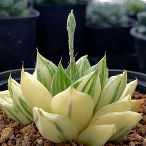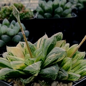 ●ススキノキ科 ツルボラン亜科 ●ハオルチア属 ●宝草錦😻😻 おはようございます。🥱🥱🥱🥱 株の調子が良いみたいで、花芽が伸びてきてます。😁😋😆 外葉は、錦の葉が多い苗ですが中央からの新芽は、葉緑素が入った葉が出て来るようになりました。☝️🤓