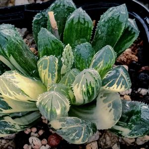 ●ススキノキ科 ツルボラン亜科 ●ハオルチア属 ●オブツーサ交配錦😻😻 おはようございます。🥱🥱🥱🥱 この子も、根腐れ➡水栽培➡植え替えを経て、今現在の姿がこの画像です。😅🤣 調子が戻ってきたみたいです。😆 外葉は、調子が悪くなってから生きようと藻掻いたんでしょうね…😭葉間がかなり空いてしまってます。😅🤣 しかし、新芽が成長してきて、葉が整ってきました。✌️😁 しかも、花芽まで出ました。☝️🤓 良かったです。😆😋😄