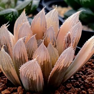 ●ススキノキ科 ツルボラン亜科 ●ハオルチア属 ●裏般若①😻😻 こちらの裏般若も花芽が出てきてますね。☝️😁 もっと葉がゴツゴツと、ごっつく入り乱れるようなカッコいい株に成長してほしいです。🤔🤔😆