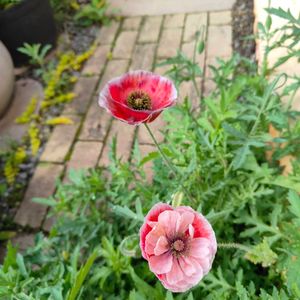 種からの“ヒナゲシ”咲きました。以外と花びらが薄いのね😙 3枚目は、同じヒナゲシの袋から…調べたら”シャーレーポピー“ですって! 変わった色合いですね😅