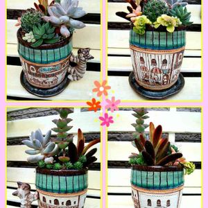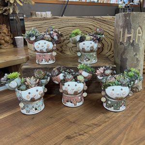 猫ちゃん鉢を寄せ直し~💞 昨年夏にお迎えした蓑葉さんの猫鉢😺 ぐるっと360度楽しめる猫鉢💜 お魚屋さん、服屋さん、cafe、パン屋さんが描かれています(≧∀≦)素敵なんです💕 冬になる頃にはシルバームーンと星の王子さまだけになってしまいました(´`:)💦 猫ちゃん鉢タグでその時みどりん寄せ植え見れま~す🍀 昨日、100均のサボテン🌵と兎耳さんかな?を入れて寄せ直ししました💞 また、違った雰囲気~( ´艸`)✨✨✨