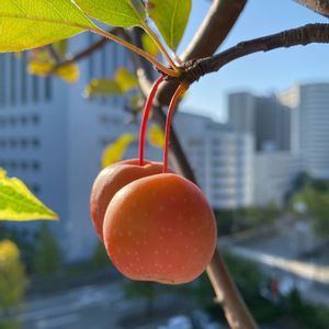 ハナカイドウの実 だと友が伝えてくれた姫林檎のような赤い実です。 ハナカイドウの花の咲く頃に、お店から小さなハナカイドウの苗木を買ってきて、この木のお花に受粉をさせるとのこと。 そんなに丹精こめて可愛い実をつけるけれど、鑑賞期間を経て、冬には鳥達の🦅餌としてなくなると…