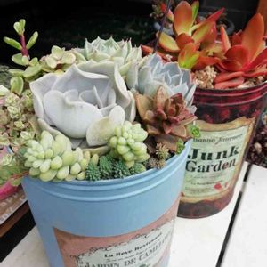 ロハス、グランマーケット、イベントで買い集めたマロさんのリメイク雑貨💕 ゴールデンウィークなんてなかったので、溜め込んでましたが、やっと寄せ植えできた💦
