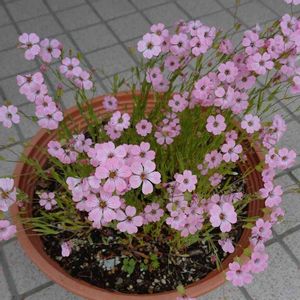 ご近所さんからいただいたサポナリアの種をかすみ草ジプシーが咲いていた鉢にまいていました。サポナリア芽が出て育っています。かすみ草もさいてます♡