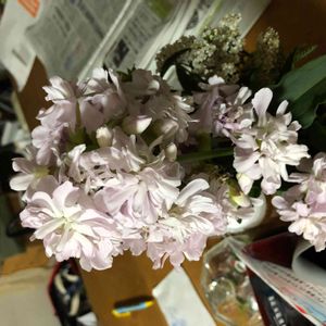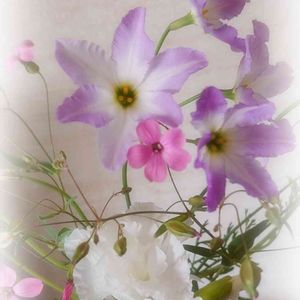 昨夜の雷雨で折れると予想したお花を慌てて切って投げ入れにしました。 最近は種と球根からのお花だけでアチコチに飾れるようになりました🎶