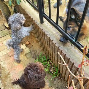 隣のシェパードに 威嚇しまくるビーンズ🤔 いつも朝から吠えあうのが日課👆 最近👀ブランも参戦 「勝てねえんだから( ˊ̱˂˃ˋ̱ )やめとけ」