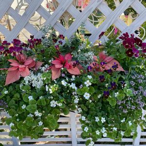 こんにちは☺️ ビオラの寄せ植えがハンギングバスケットのお花さん達がモリモリ😆💕 今日も素敵な一日をお過ごしください🍀