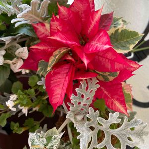 こんにちは☺️ お客様へのリース、完成❣️ 斑入りのポインセチア🍀 🍀ポインセチア 🍀シロタエギク 🍀バコパ 🍀パンジー 🍀ハツユキカズラ 🍀アリッサム 今日も素敵な午後をお過ごし下さいね🍀