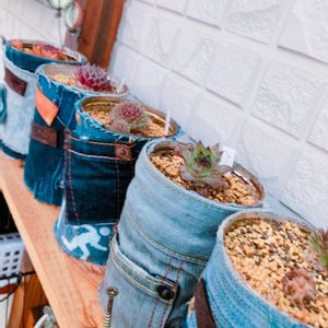 デニム缶ゾーン🥫センペルが植えてある😆デニム缶もっと作りたいな✨