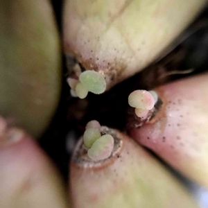あービックリした・:*+.\(( °ω° ))/.:+ かくかくしかじかで2ヶ月ほど前の雨の翌日にうちに来た、オボロヅキの葉挿しッ子。 シッワシワで絶対ダメやと思ってたけど、ポイすることができず何となく棚の上に置きっぱにしてたら、、 あービックリ!!しっかりお子ちゃま誕生してるー♡ 驚きすぎて、マジな二度見しました(〃ω〃) しっかし、強いなぁ〜🤔🤔