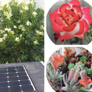 おはようございます😃 ベランダからパチリ📸 左の木、スモークツリーでしょうか?隣のマンションにいつの間にか現れた😅 うちの庭木が飛んで行ったのかと思いましたが、うちの庭木には、この木はありません、、、鳥が種を落としたのかな🤔 うちの増築の1階の屋根を有に越しています(⌒-⌒; ) 右上は今朝のダブルデライトさん。右下は多肉チャンたち^_^♪♪♪ 福娘ののお花が咲いています♪♪♪