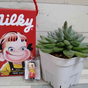 🏷ペコちゃん祭り まつぴよさんに頂いた、限定品のミルキー⤴️⤴️⤴️ このキモカワなペコちゃんが可愛い💕 こけしのストラップも超お気に入りです。 多肉は「ムアレ」 買った時は紫だったのよ。 大きくなって、双頭になっちゃった。 そろそろ、4.5号鉢に引っ越しだね。